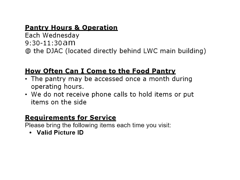The LWC Food Pantry exsist to joyfully and prayerfully assist with your physical and spiritual needs.